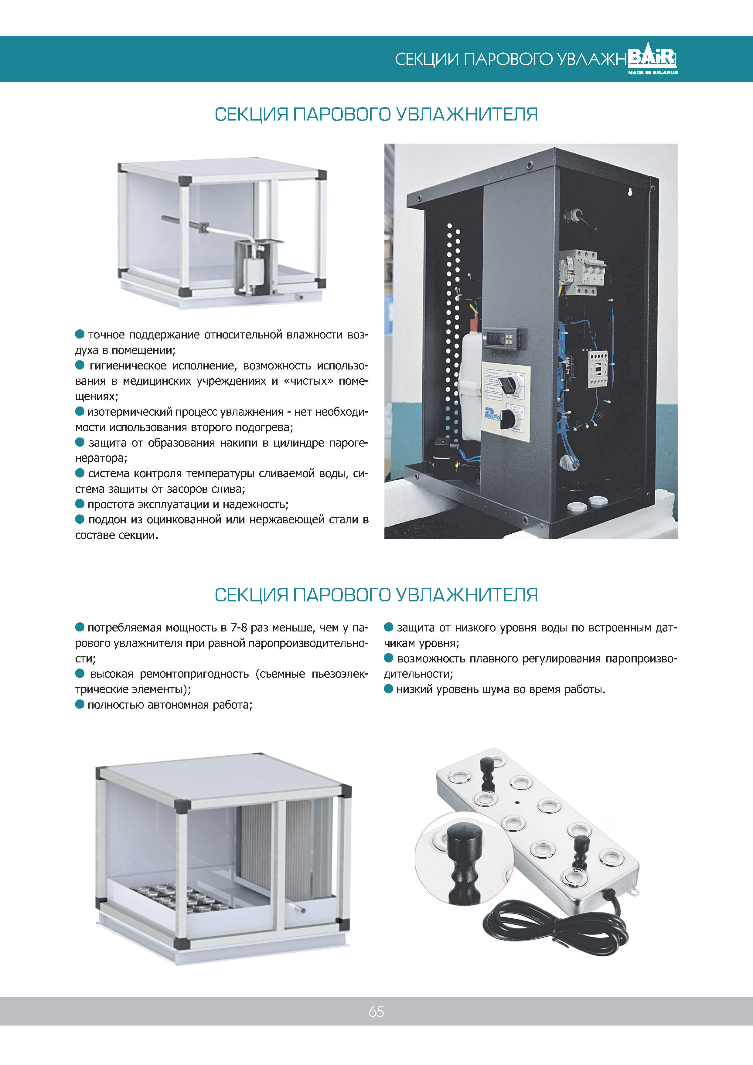 • Секция парового увлажнения состоит из электрического парогенератора, парораспределительной трубки (монтируется внутри секции), эластичного трубопровода, соединяющего парораспределительную трубку с резервуаром парогенератора и системой автоматического управления. Парогенератор представляет собой легкий и компактный шкаф из алюминиевых пластин, внутри которого находятся: цилиндр с электродами, встроенный контроллер с микрочипом внутри цилиндра, дренажный насос. Цилиндр наполняется водой из водопроводной сети в автоматическом режиме (давление 0,1-1,0 Мпа). Процесс увлажнения паром – изотермический. Автоматика контролирует работу парогенератора, защищает систему от скопления накипи в цилиндре, контролирует температуру сливаемой воды.